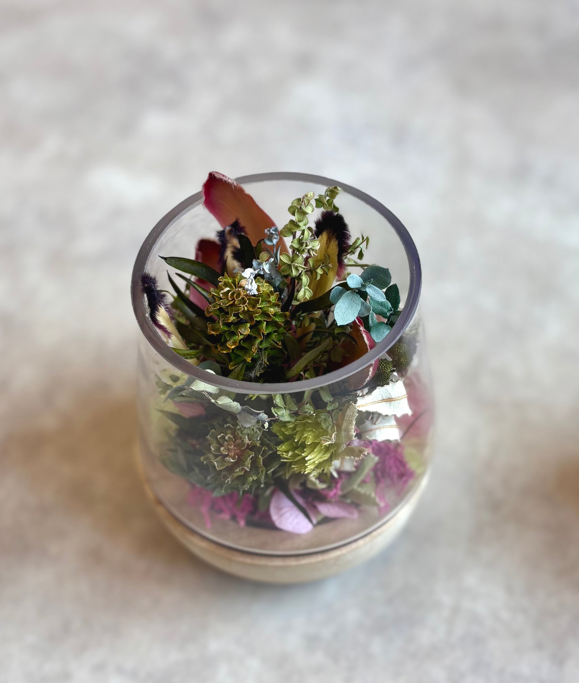 ドライフラワーアレンジの上から